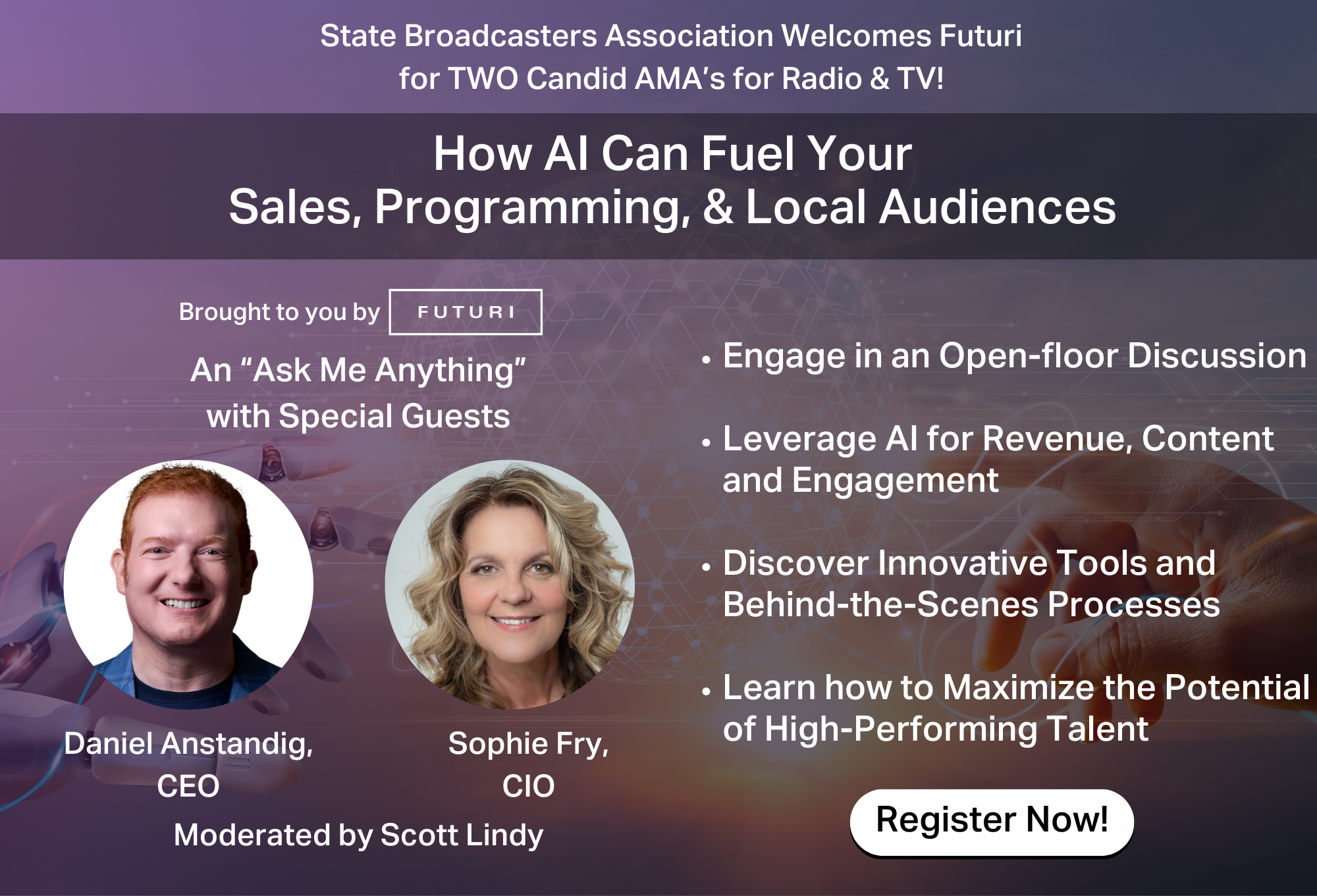 Join us for an exclusive two-part 'Ask Me Anything' (AMA) series with Futuri executives Daniel Anstandig (CEO) and Sophie Fry (CIO), as they provide insights into the current state of AI in media, setting the stage for an engaging open-floor discussion. Gain practical knowledge on leveraging AI to diversify revenue streams, streamline content repurposing, and strengthen community engagement.